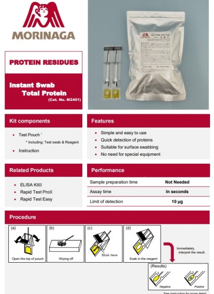 ใช้ทดสอบหาเศษอาหารก่อภูมิแพ้ขนาดจิ๋วที่อาจหลงเหลืออยู่บนผิวสัมผัส หลังการล้างทำความสะอาด food contact surface ที่อาจสังเกตไม่พบด้วยตาเปล่า ในพื้นที่ 100 ตร. ซ.ม. เป็นการทดสอบความสะอาดของภาชนะสัมผัสอาหาร แบบ แสดงผลได้ทันที่ Instant Swab
