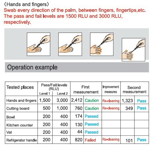 • พื้นผิวสัมผัสอาหาร Food contact soft surface                  : 500-1,000 RLUs