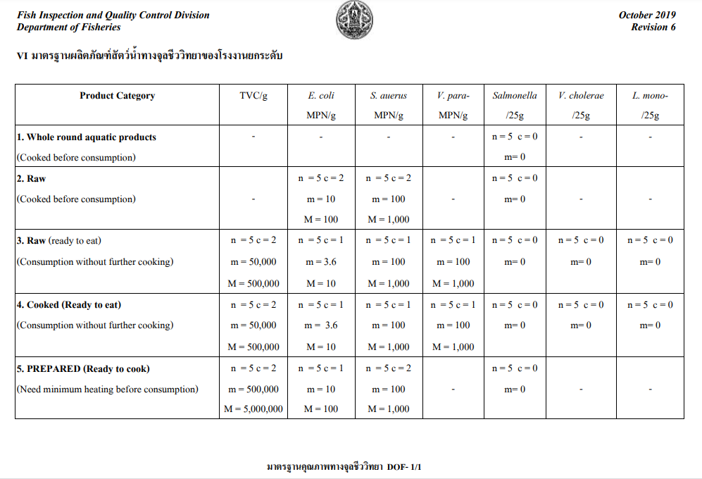 รายการตรวจทดสอบทางด้านจุลชีววิทยา สำหรับผลิตภัณฑ์สัตว์น้ำ